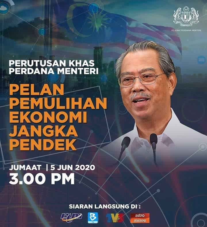 Ikuti Perutusan Khas Perdana Menteri berkenaan Pelan Pemulihan Ekonomi Jangka Pendek pada hari esok:.Jumaat|5 Jun 2020Jam 3.00 Petang.Siaran Langsung di:RTM, Bernama, TV3 dan Astro Awani…@muhyiddinyassin_official@mkn_rasmi@bernamatvofficial@rtm_malaysia@501awani@tv3malaysia #staysafe#stayathome#dudukdirumah#kitajagakita