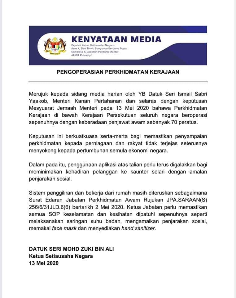 [KENYATAAN MEDIA] PENGOPERASIAN PERKHIDMATAN KERAJAAN Sumber: Datuk Seri Mohd Zuki Ali, Ketua Setiausaha Negara Saifuddin Abdullah / Kementerian Komunikasi dan Multimedia Malaysia, KKMM #COVID19#KitaTeguhKitaMenang#KomunikasiKita#StayAtHome#JabatanPenerangan#DudukDiRumah#KitaJagaKita#PenjarakanSosial#PutuskanRangkaianCovid19#MovementControlOrder#PerintahKawalanPergerakan#PatuhiPerintahKawalanPergerakanBersyarat#KawalanKendiri#KitaMestiMenang