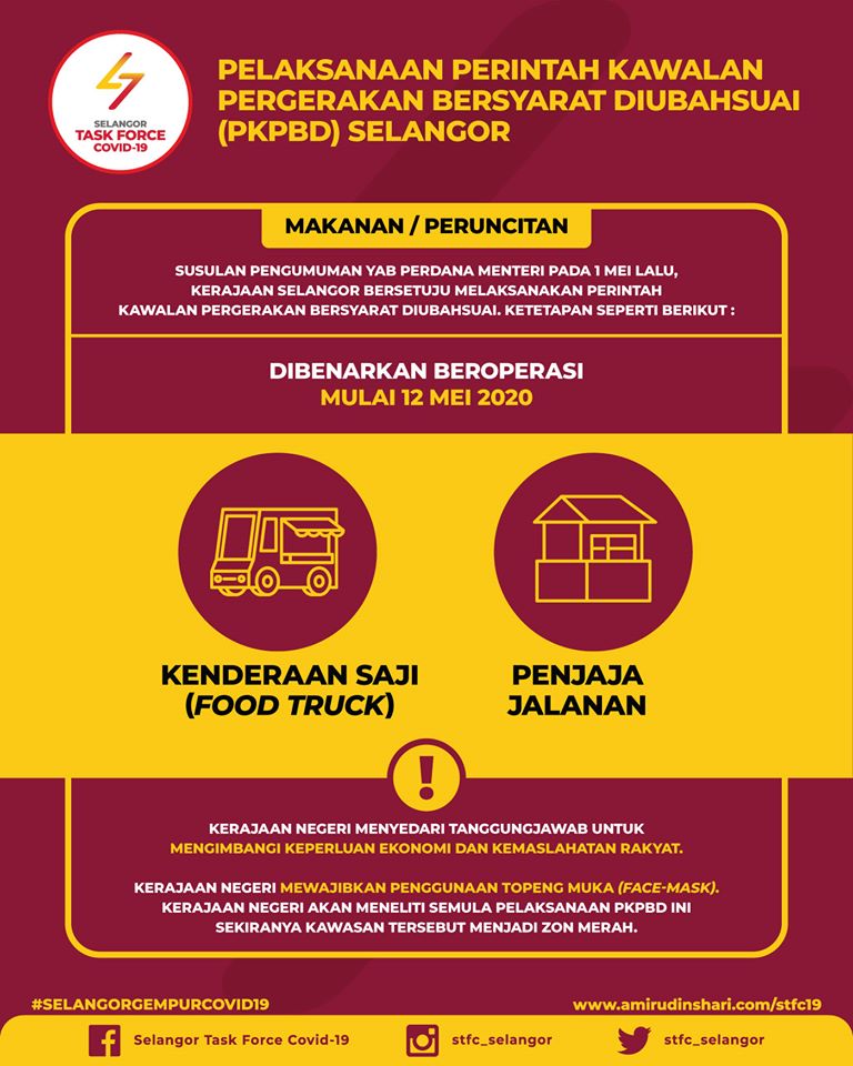 Makanan dan Peruncitan Sekadar peringatan, kenderaan saji (food truck) dan penjaja jalanan hanya boleh mula beroperasi BERMULA 12 Mei. Tidak boleh beroperasi sama seperti restoran, medan selera dan gerai makan (berbumbung). Namun facemask adalah wajib! #SelangorGempurCovid19#STFC#PKPBD#Covid19#StayAtHome#DudukDiRumah#KitaJagaKita#PenjarakanSosial#PutuskanRangkaianCovid19#MovementControlOrder#PerintahKawalanPergerakan#PatuhiPerintahKawalanPergerakanBersyarat#KawalanKendiri#KitaMestiMenang Amirudin ShariDr […]