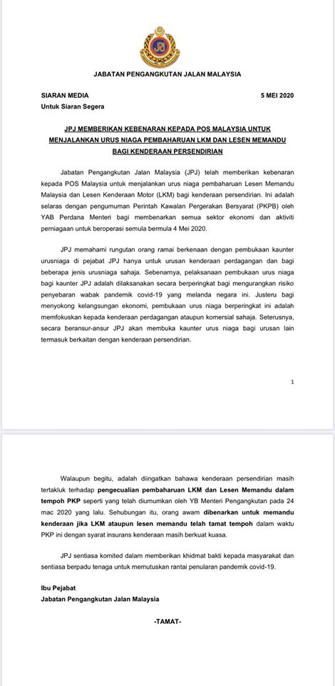 JPJ memberi kebenaran kepada Pos Malaysia untuk menjalankan urus niaga pembaharuan Lesen Kenderaan Motor dan Lesen Memandu bagi kenderaan persendirian. #Covid19#StayAtHome#DudukDiRumah#KitaJagaKita#PenjarakanSosial#PutuskanRangkaianCovid19#MovementControlOrder#PerintahKawalanPergerakan#PatuhiPerintahKawalanPergerakanBersyarat#KawalanKendiri#KitaMestiMenang