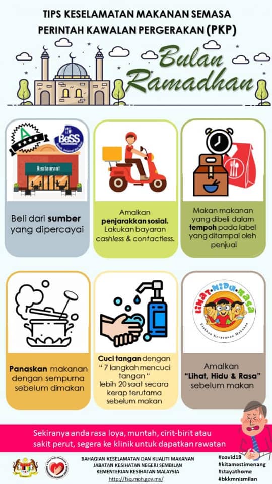 Tips Keselamatan Makanan Semasa Perintah Kawalan Pergerakan (PKP) di bulan Ramadan. Pastikan semua tips diikuti untuk menjamin keselamatan makanan di bulan mulia ini #StayAtHome#DudukDiRumah#KitaJagaKita#PerintahKawalanPergerakkan#Covid19#TakPastiJanganKongsi#KitaMestiMenang